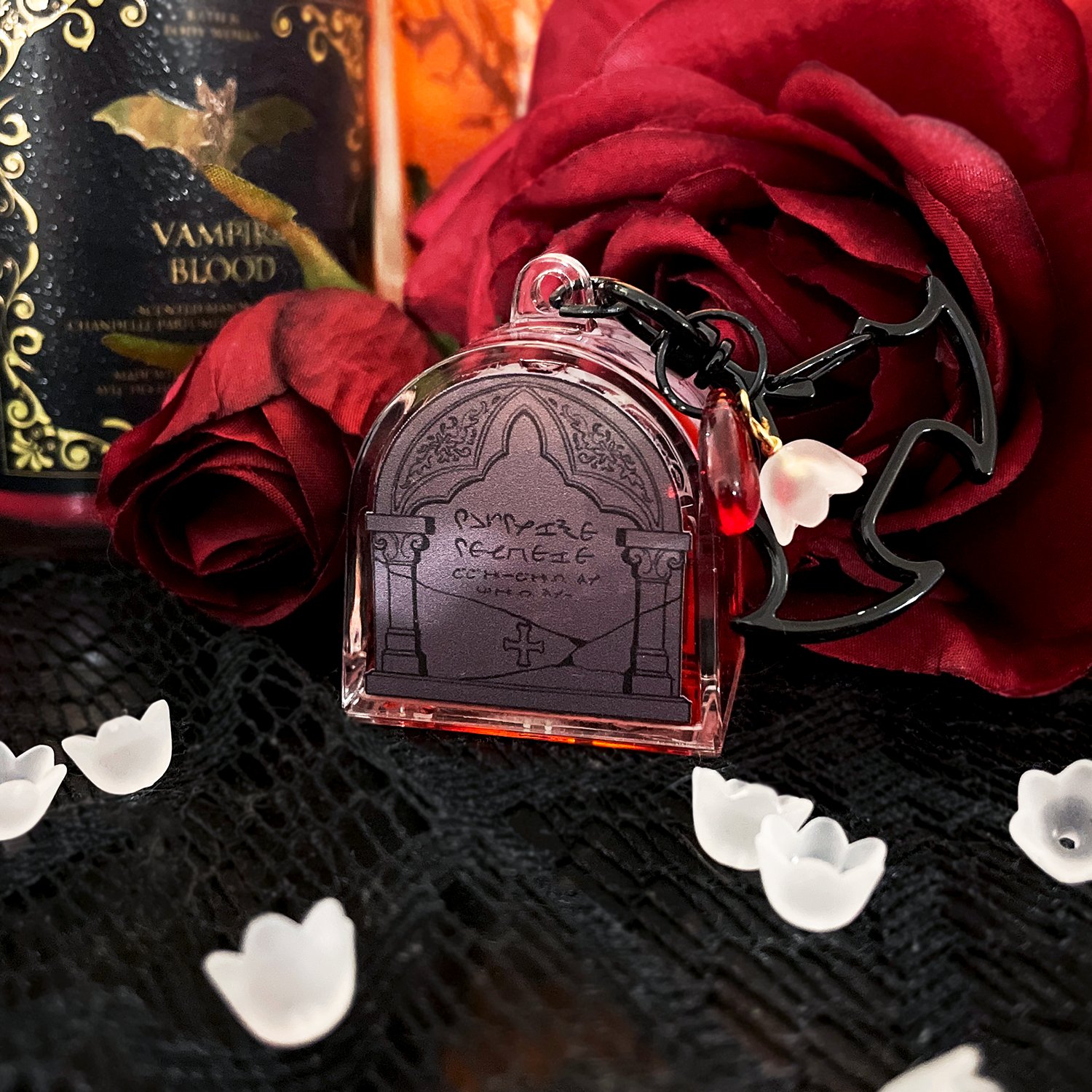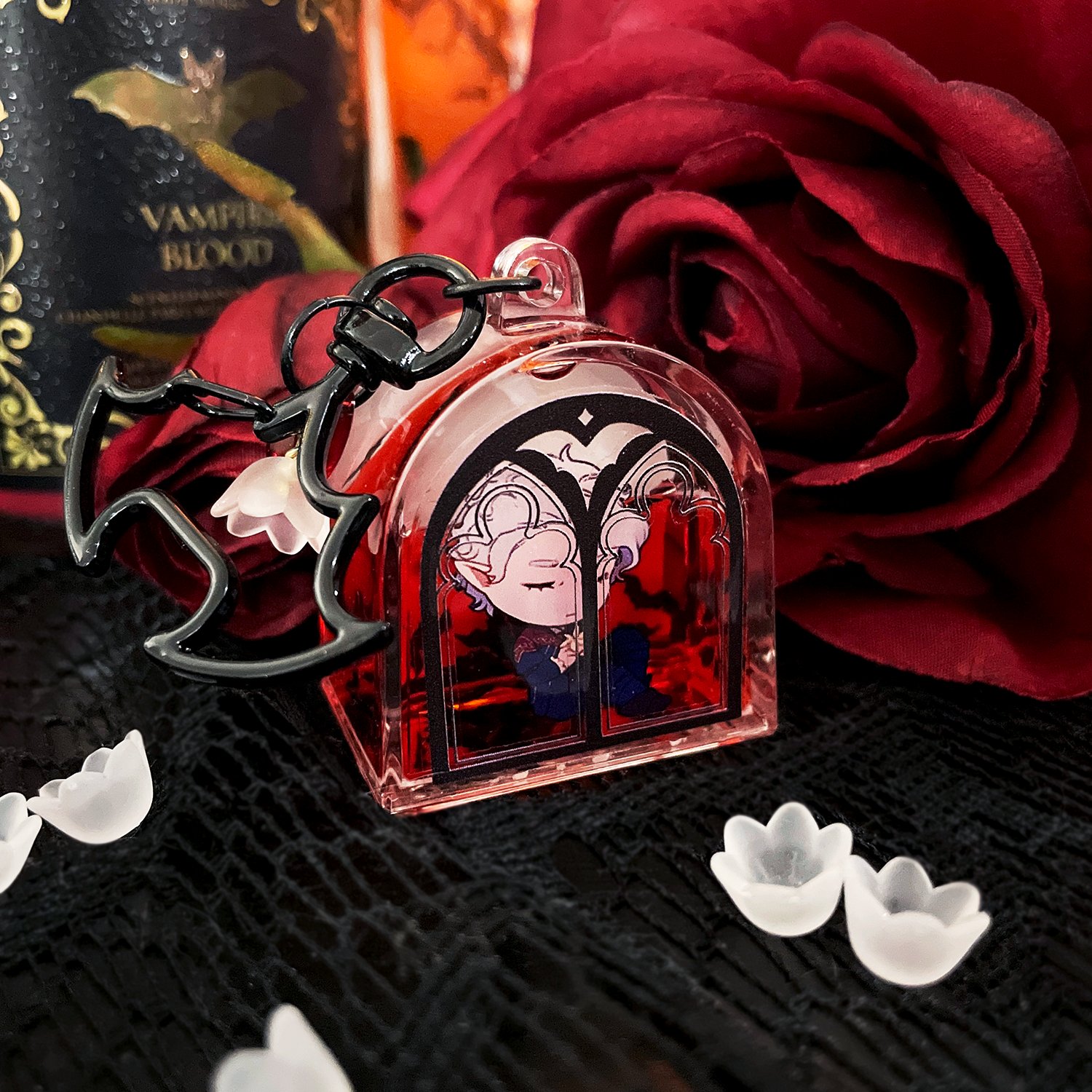 Astarion in a little arch bottle. You can rattle him around in blood and bats. The front is an arch window, the backside is his grave. He comes with a bat shaped lobster clasp, and a little white flower and blood drop charms.